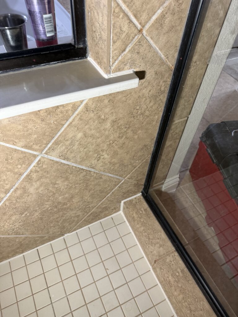 The tile was not the problem. The leak was caused by failed and deteriorated caulking at critical shower joints, including: